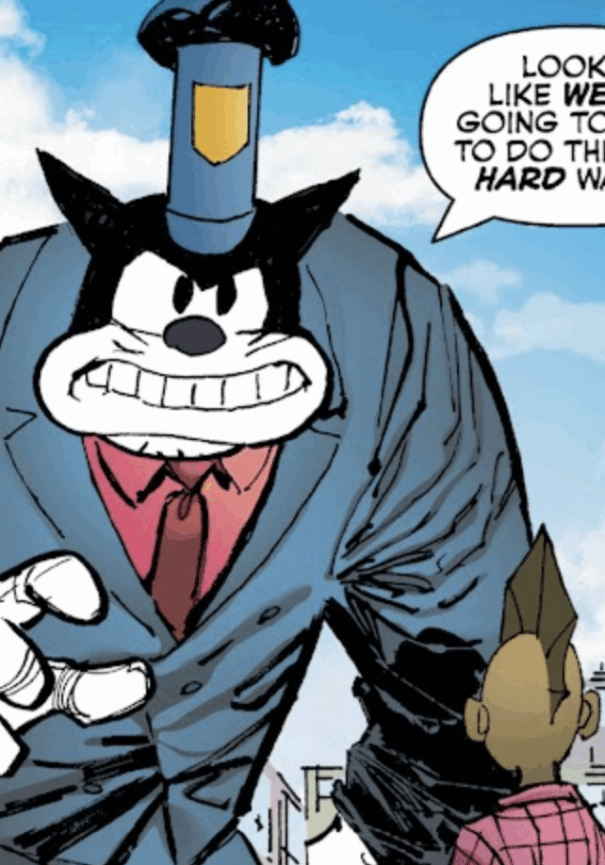 Pete is a large cat that works for Mickey Mouse as a driver/bodyguard.  He nearly attacks Tyrone Dragon, but stops when he realizes he’s being recorded.